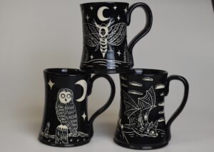 Every piece in my shop is handmade, hand carved, and individually designed by me. I primarily create pottery using Sgrafitto which is a decorative technique that involves scratching through a top layer of black slip to reveal a contrasting color underneath.